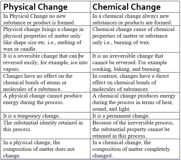 There are many differences between physical and chemical changes and it is important to understand them to be able to understand these concepts clearly. The comparisons and differences between physical and chemical changes are given below along with their examples. To understand physical and chemical properties and changes better, it is important to know what they are. Visit physical and chemical changes to know more about them in detail. In this article, the differences between physical changes and chemical changes are provided in a tabular format.