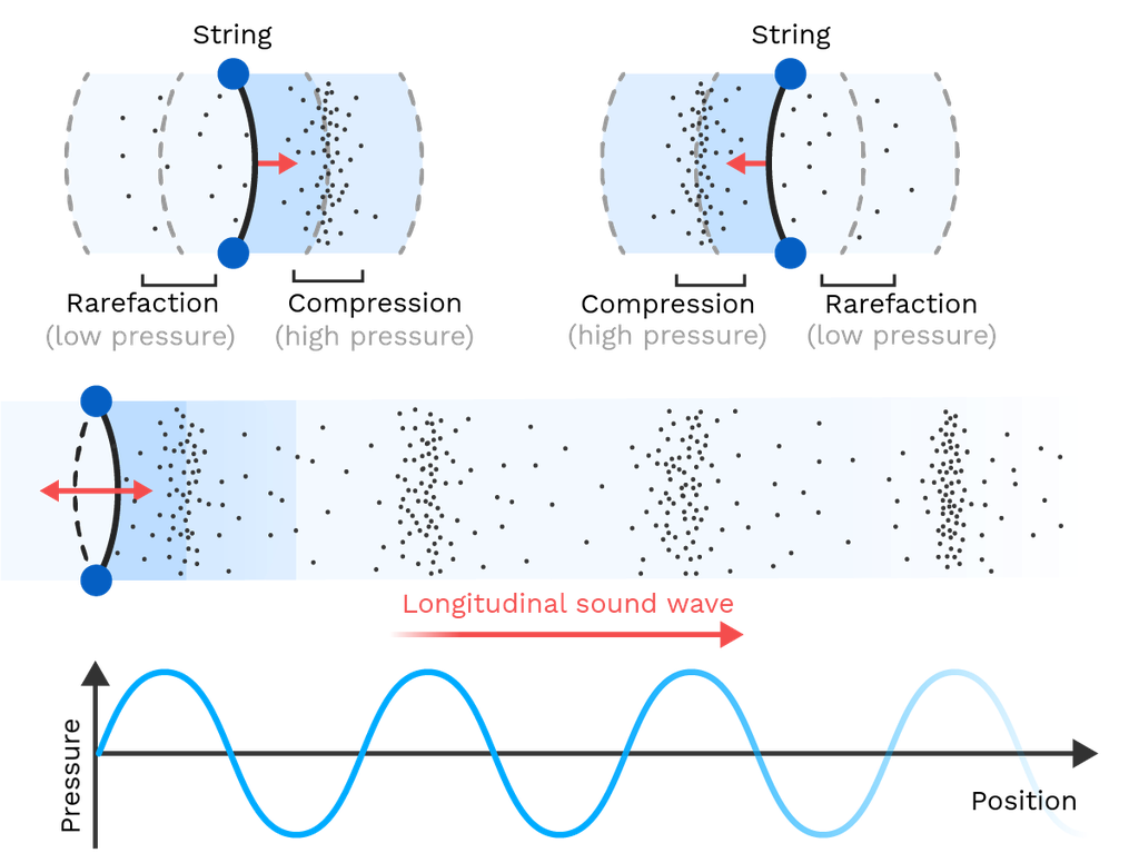 The sound produced is transmitted through pressure waves within the object. An object vibrating back and forth rapidly pushes air forward to make way for itself. When a force is applied on an atom, it moves from its original position and exerts a force on the adjacent atom. This motion from one particle to another continues throughout the medium. In this manner, the sound is transmitted through a medium.