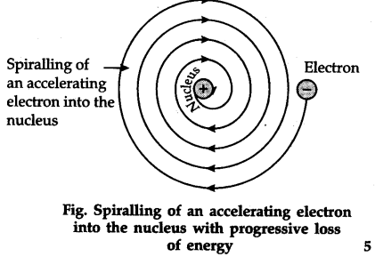 Rutherford proposed that the electrons revolve around the nucleus in fixed paths called orbits. According to Maxwell, accelerated charged particles emit electromagnetic radiations and hence an electron revolving around the nucleus should emit electromagnetic radiation. This radiation would carry energy from the motion of the electron which would come at the cost of shrinking of orbits. Ultimately the electrons would collapse in the nucleus. Calculations have shown that as per the Rutherford model, an electron would collapse into the nucleus in less than 10-8 seconds. So the Rutherford model was not in accordance with Maxwell’s theory and could not explain the stability of an atom.