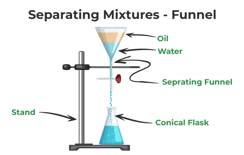Separating funnel is used mainly to segregate two immiscible liquids. The mechanism involves taking advantage of the unequal density of the particles in the mixture. Oil and water can be easily separated using this technique.
