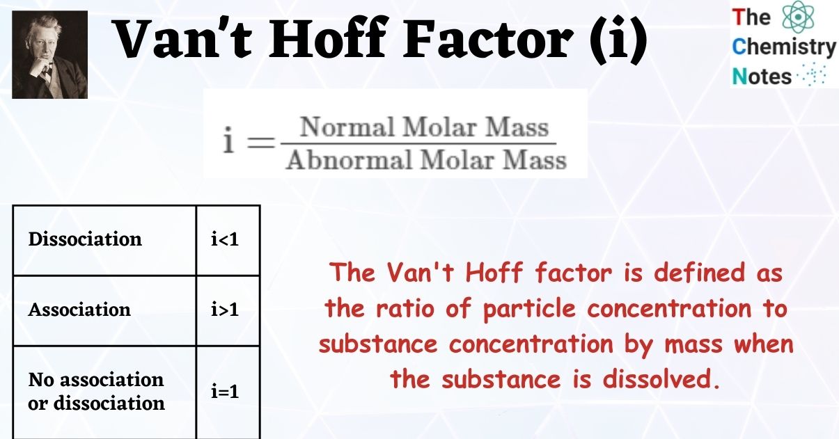 The extent to which a substance associates or dissociates in a solution is described by the Van’t Hoff factor. For example, when a non-electrolytic substance is dissolved in water, the value of i is generally 1. However, when an ionic compound forms a solution in water, the value of i is equal to the total number of ions present in one formula unit of the substance.